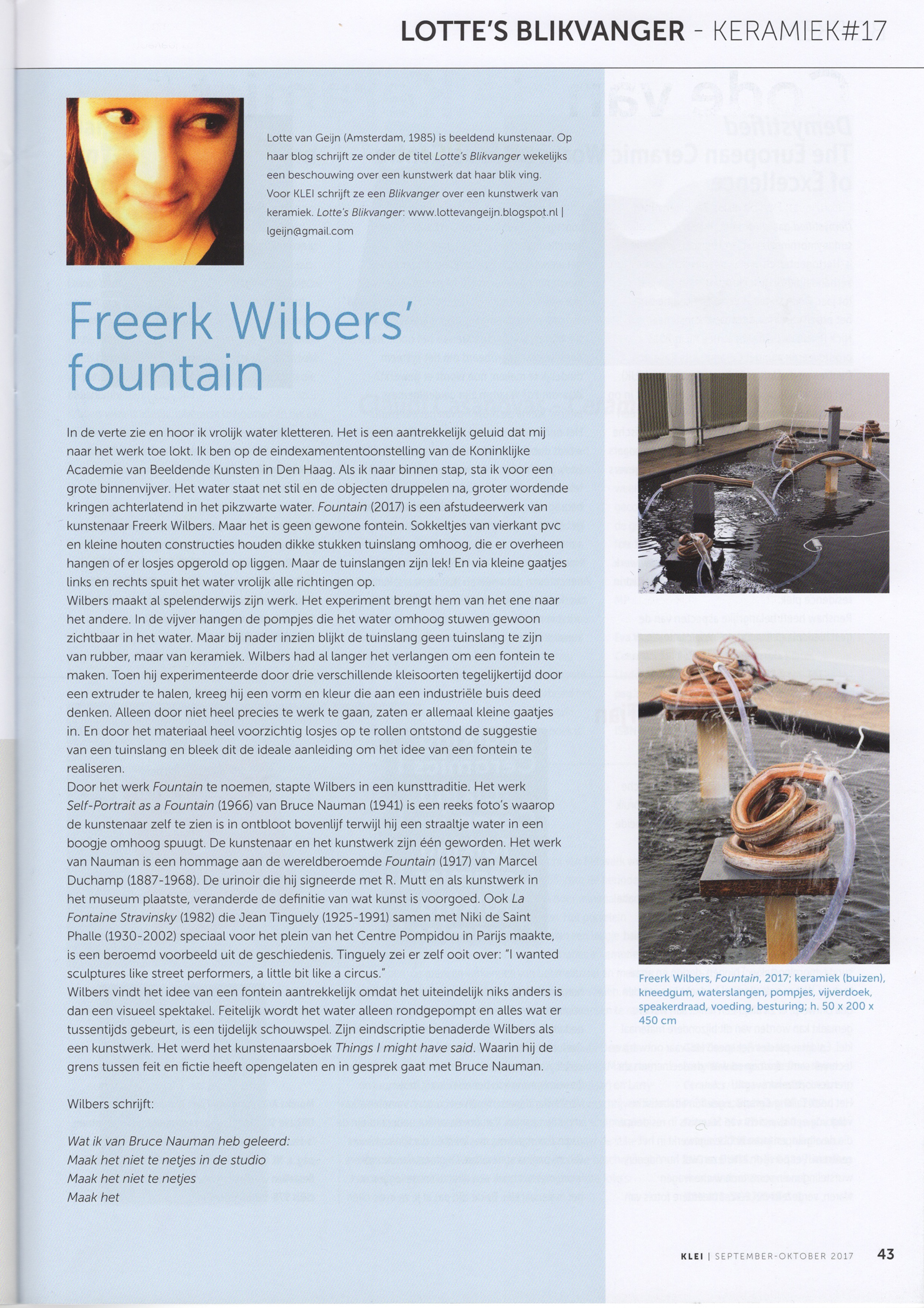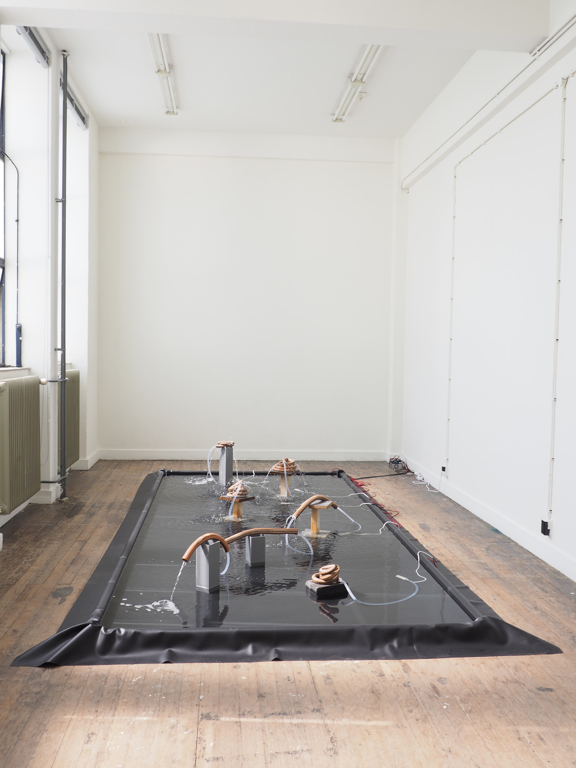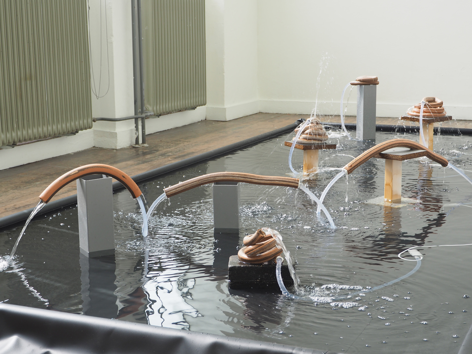 This work originated from working in a ceramics workshop. A device there that particularly fascinated me was the extruder, a simple press in which clay is squeezed through various moulds; think of it as a pasta maker for clay. Working with different coloured clays (white, red and brown, in this case) I made tubes that looked very much like garden hose. After baking the clay it turned out that air bubbles had created holes here and there - the garden hoses were leaky. I connected this to a fond memory - real or imagined - of seeing a garden hose lying in the grass in the garden in summer; a late afternoon sun illuminating a tiny spray of golden water drops arcing out of a small hole in the hose. A lot of experimentation followed to figure out how to make this happen and then to figure out a pleasing ‘schedule’ for the fountain - always-on is boring after a while. I figured out (as with the previous work Instrument) that the balance between activity and inactivity is very important. I find the sound of water dripping, after the pumps switch off, one of the most pleasing aspects of the work.