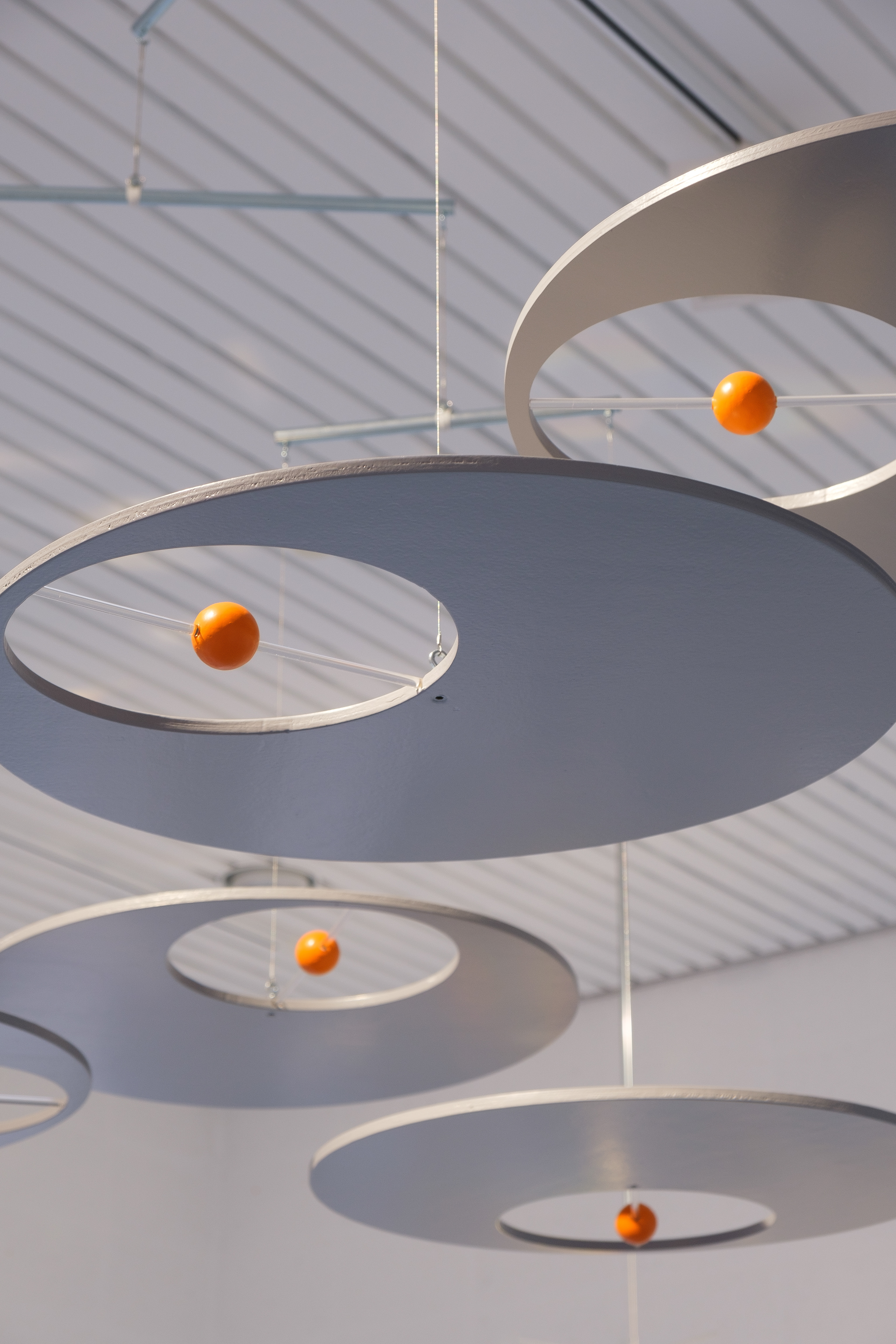 ‘Eightfold’ is made up of eight grey circular discs, each with a smaller circle removed. A bright orange sphere is suspended in the centre of the circular void, as a counterweight to the mass removed. Each of the discs is carried along circular paths, sometimes rapidly, sometimes languidly, spinning around its centre and around each other. The orange spheres chase each other like little planets propelled by invisible forces, moving apart and coming together again endlessly.