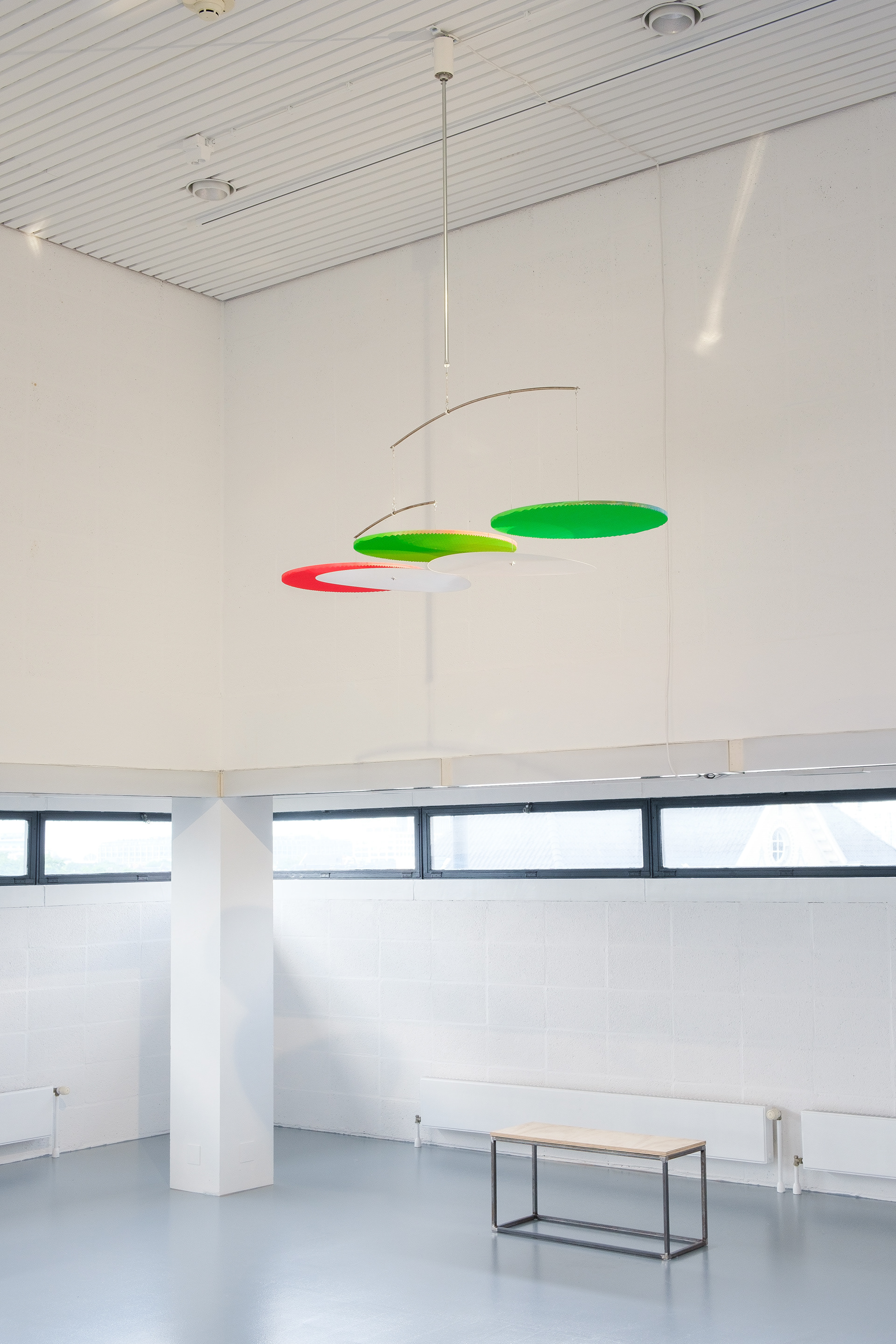 ‘RGB’ is a work that changes colour. As it spins, one minute it is green and blue, the next it is red, and there are in-between moments when you can’t quite tell the colour. The title refers to the colour space using the primary colours red, green and blue. These three mixed together can produce most other colours. This is the principle behind a TV or computer screen, where every pixel is made of a tiny red, green and blue light. In a way, ‘RGB’ is a pixel.