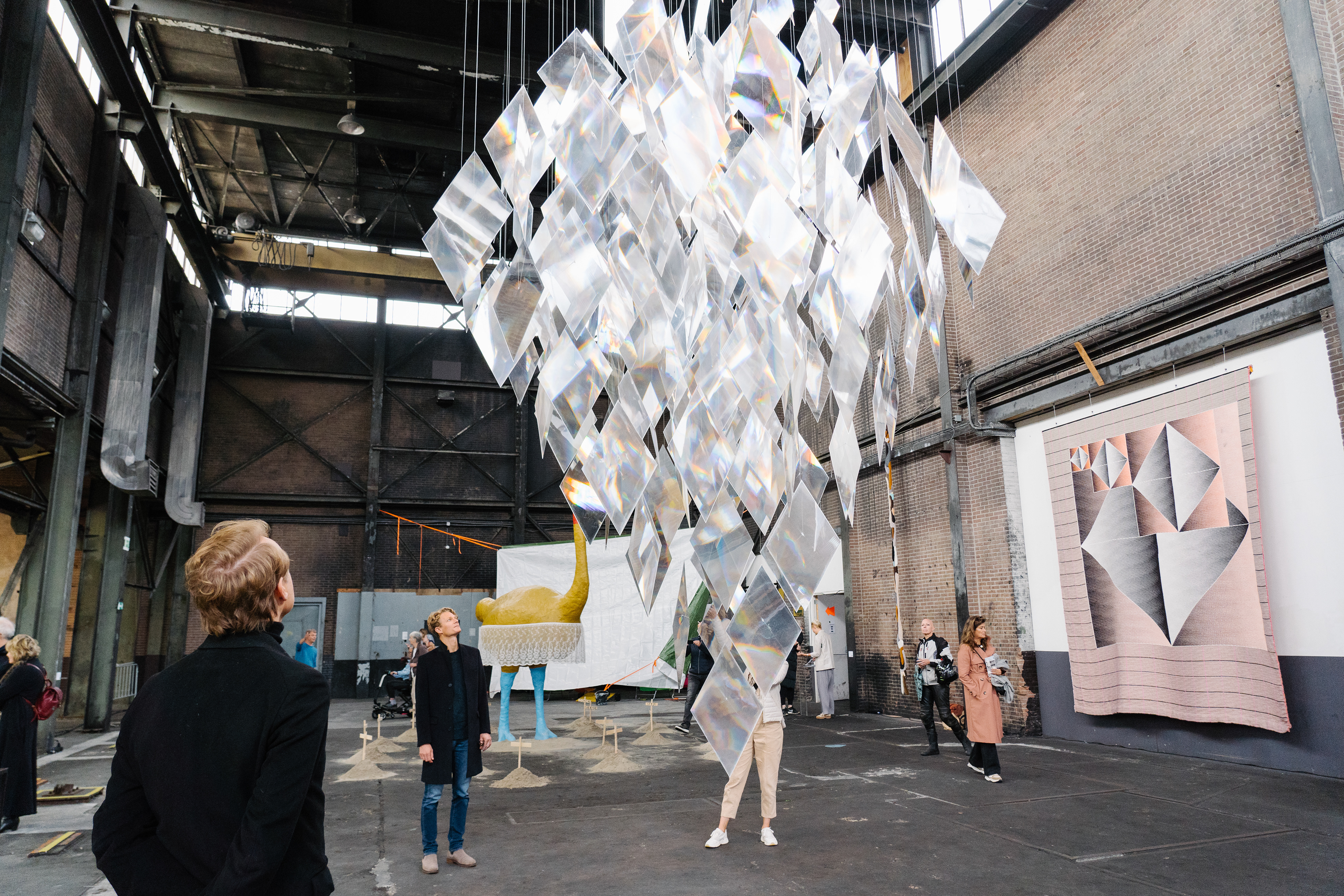 I made Large Diamond for Big Art 2021 at the Hembrugterrein, Zaandam. It consists of 183 diamond-shaped pieces of special reflective acrylic material. They are suspended from six aluminium frames, that can rotate with respect to each other. The diamonds also rotate on their own axis. The work contains about 500 meters of steel cable. With a height of 14m (7,5m for the diamond shape alone) it dominates this enormous hall.